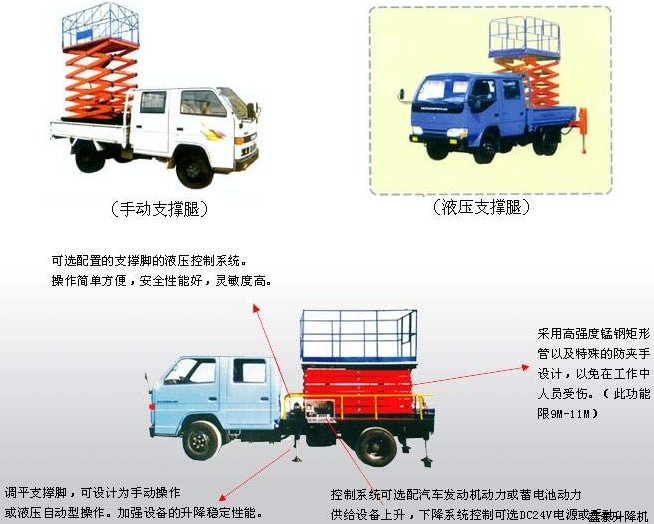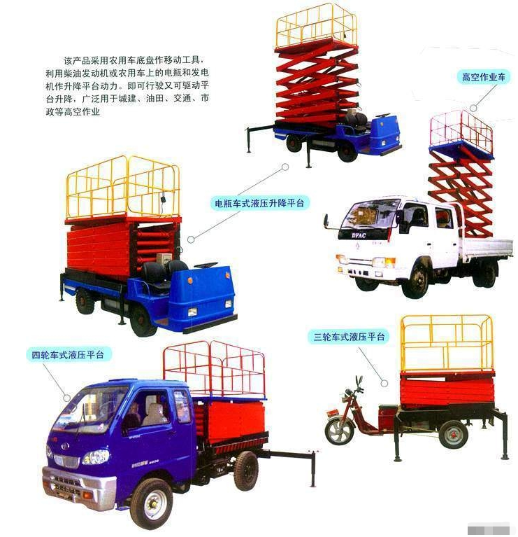把升降机安装在汽车上的高空作业设备。由专用底盘、工作臂架、三维全旋机构、柔性夹紧装置、液压系统、电气系统和安全装置等部分组成。由升降机和电瓶车配套改装而成的高空作业平台。它利用汽车发动机或电瓶车原有直流动力,勿须外接电源,即可行驶又可驱动升降平台,它移动方便,作业流动范围广,产品具有无污染,无尾气,作业范围大,流动性强。